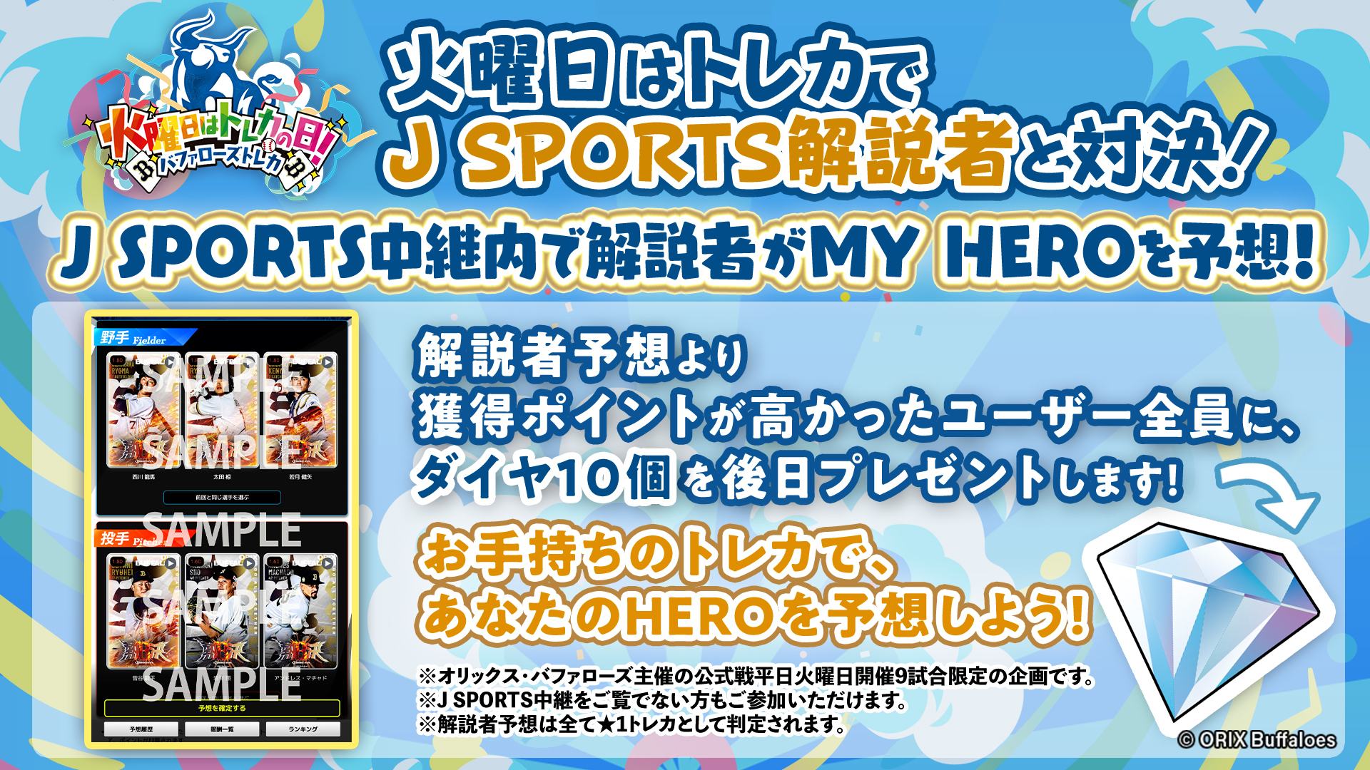 解説者予想より獲得ポイントが高かったユーザ全員に、バファローズトレカサービス内でダイヤ10個をプレゼントします!