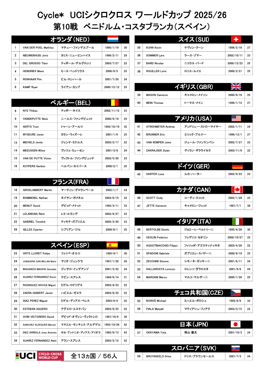 UCIシクロクロス ワールドカップ 2025/26 第10戦 ベニドルム・コスタブランカ(スペイン)のスタートリストを掲載しました。