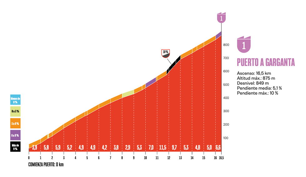 スプリンターにはいきなり試練が与えられる。文字通り0km地点から、1級山岳ガルガンタの、全長16.5kmという長い上りへと挑まねばならないのだ。平均勾配5.1%の山道の後半には、約1.5kmにわたり二桁台の急坂ゾーンも待ち受ける。
