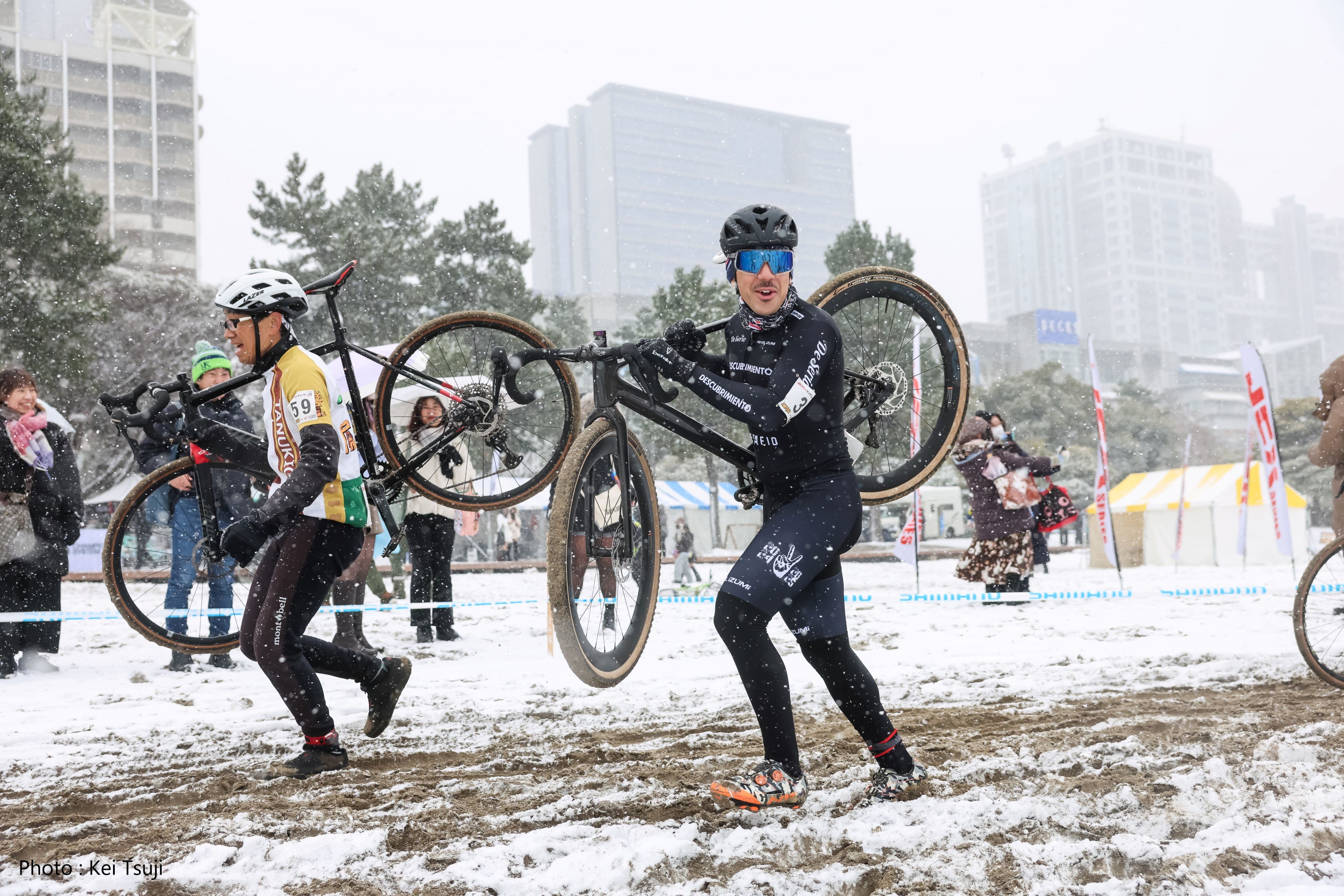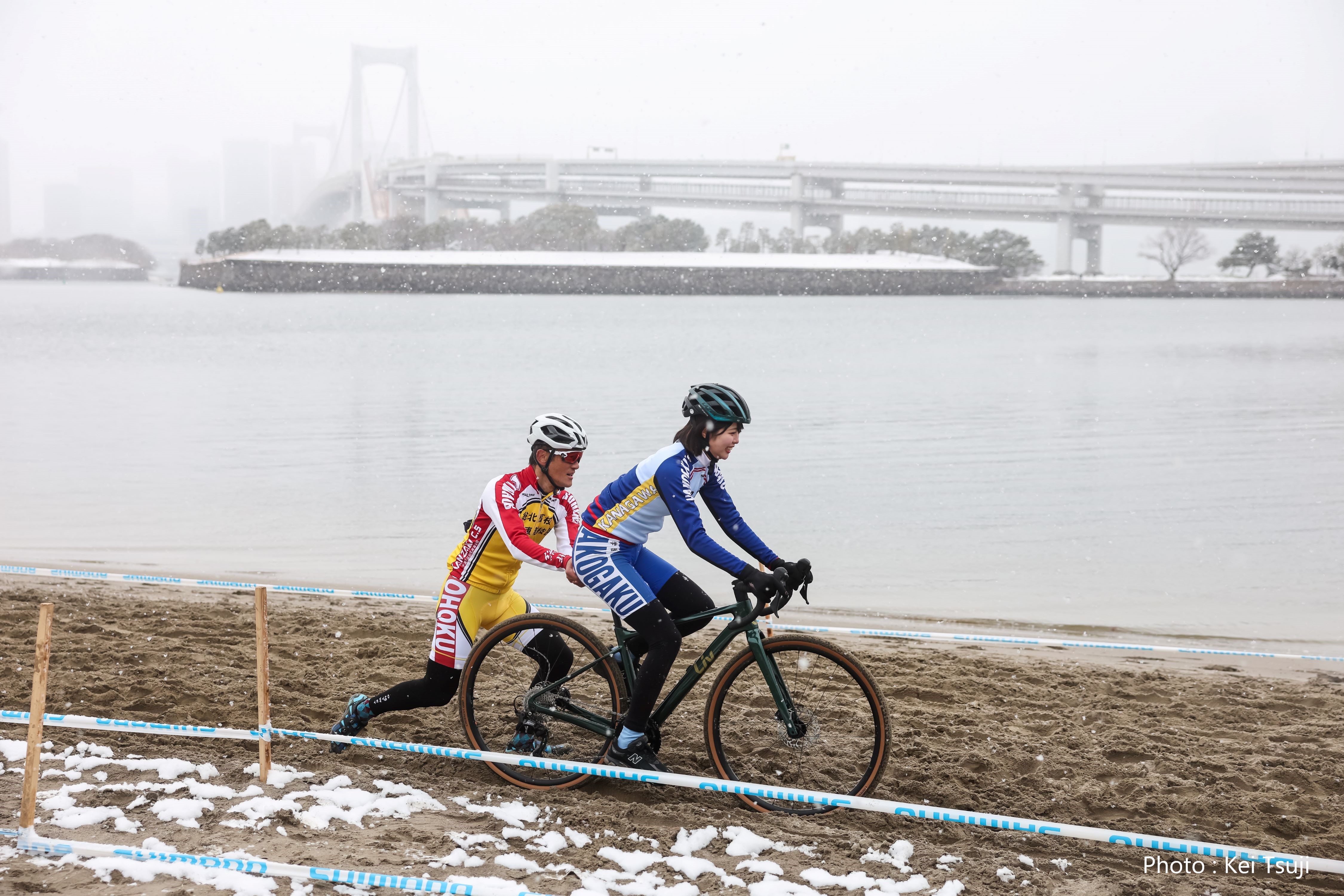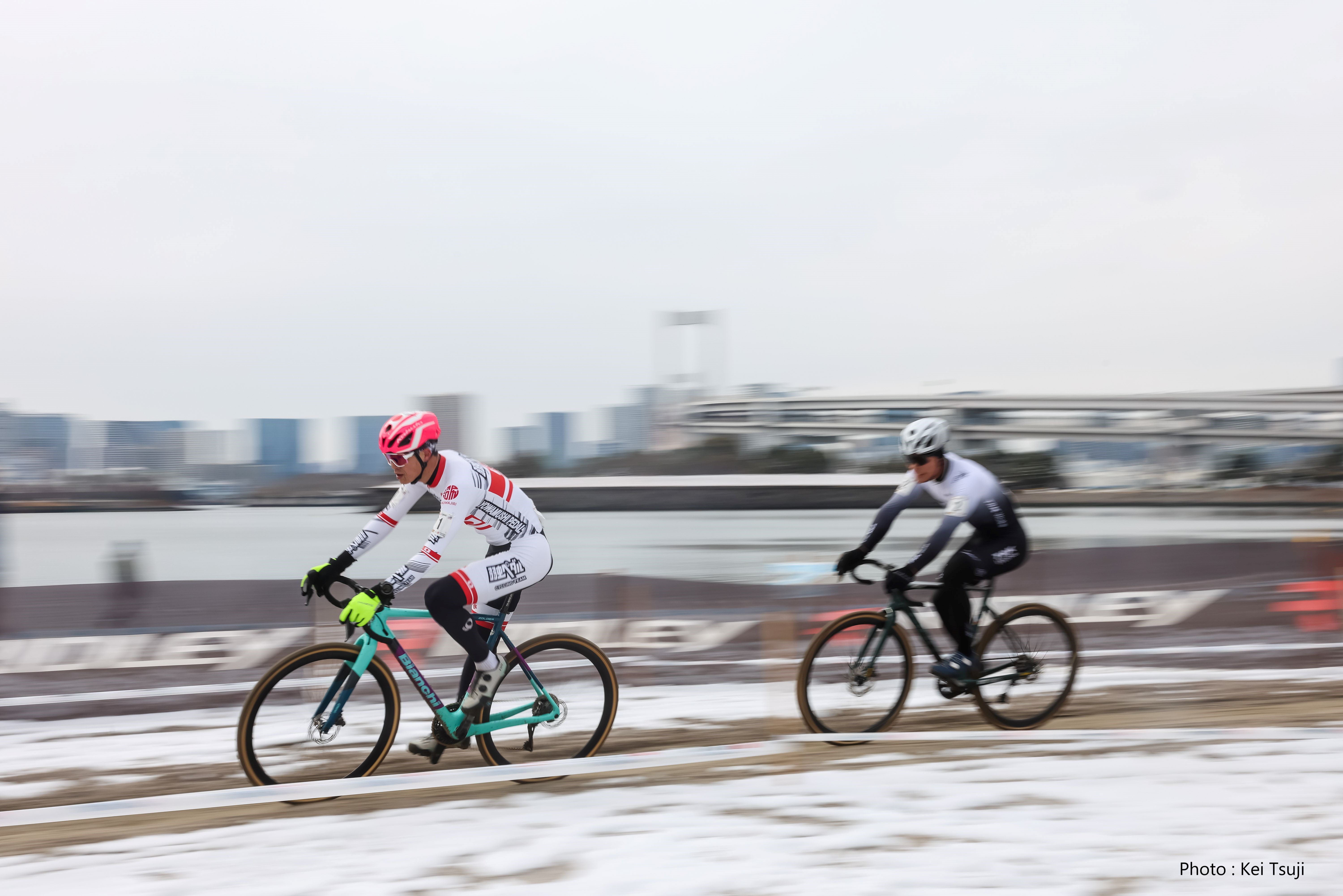 「寒すぎて2時間走るのが限界」とのコメント通り寒そう・・・。いつもこの時期ならではの写真をありがとうございます。そしていつもどうやってロードバイクを自立させているのか不思議で。ちなみに撮影の仕事では透明なアクリル棒で自立させたり、画像修正で棒を消すことも。