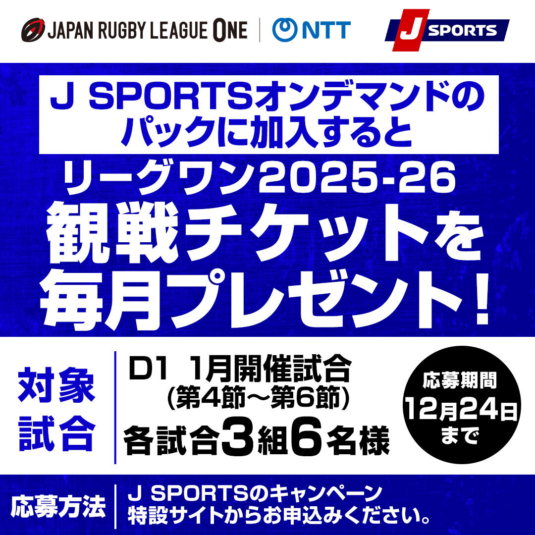 J SPORTSオンデマンドのパックに加入すると、毎月抽選でリーグワン2025-26の観戦チケットが当たる!