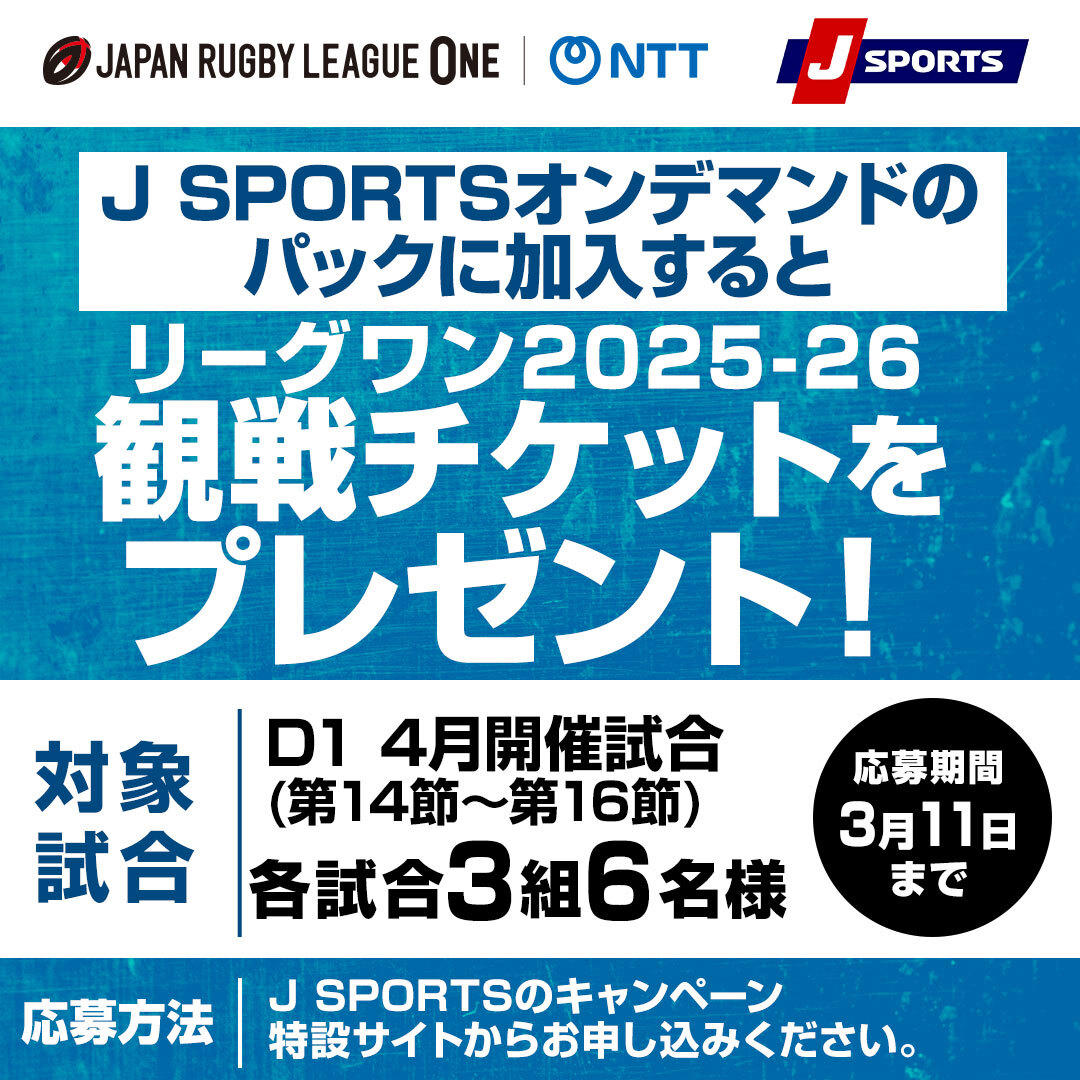 J SPORTSオンデマンドのパックに加入すると、【4月開催分】ジャパンラグビー リーグワン2025-26観戦チケットをプレゼント!