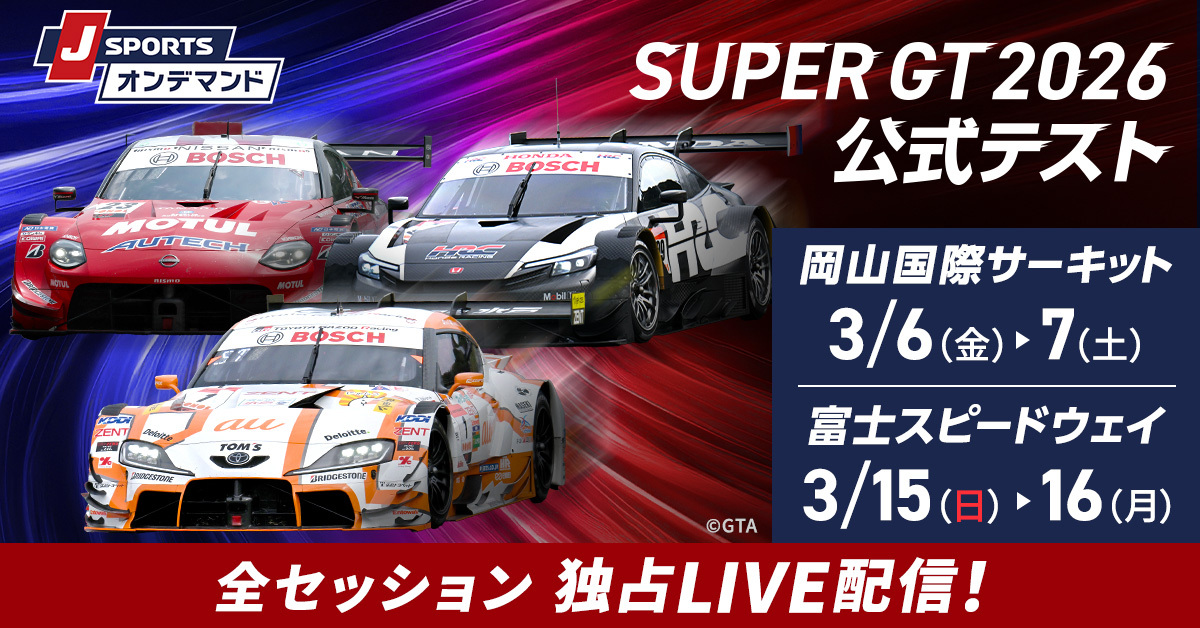 2週連続で岡山国際サーキットと富士スピードウェイにて開催される「SUPER GT 2026 公式テスト」。J SPORTSオンデマンドでは全日程・全セッションを独占LIVE配信します。開幕前の緊張感溢れる公式テストの模様をぜひJ SPORTSでお楽しみください。※放送は一部のセッションが録画放送となります。