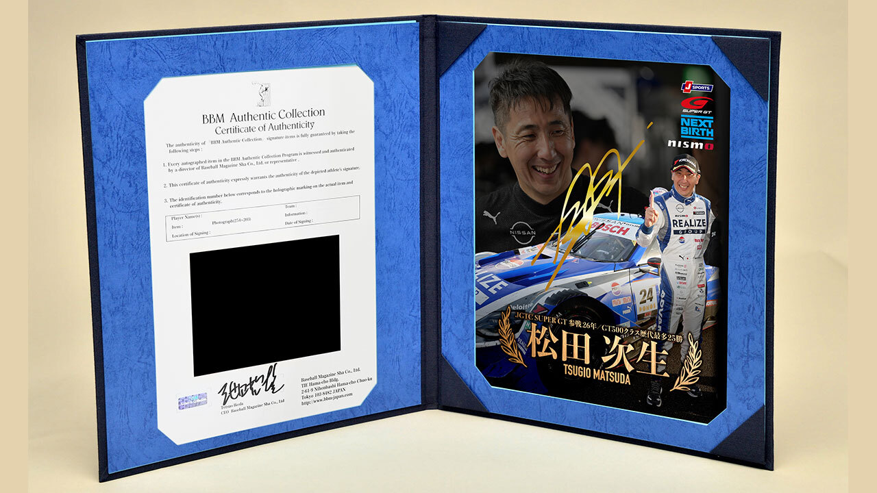 J SPORTSでは、松田氏の26年におよぶJGTC/SUPER GTでの功績を称え、直筆サイン入り記念フォトファイルを発売します。ファンの皆さまにとって永く大切にしていただけるメモラビリアです。